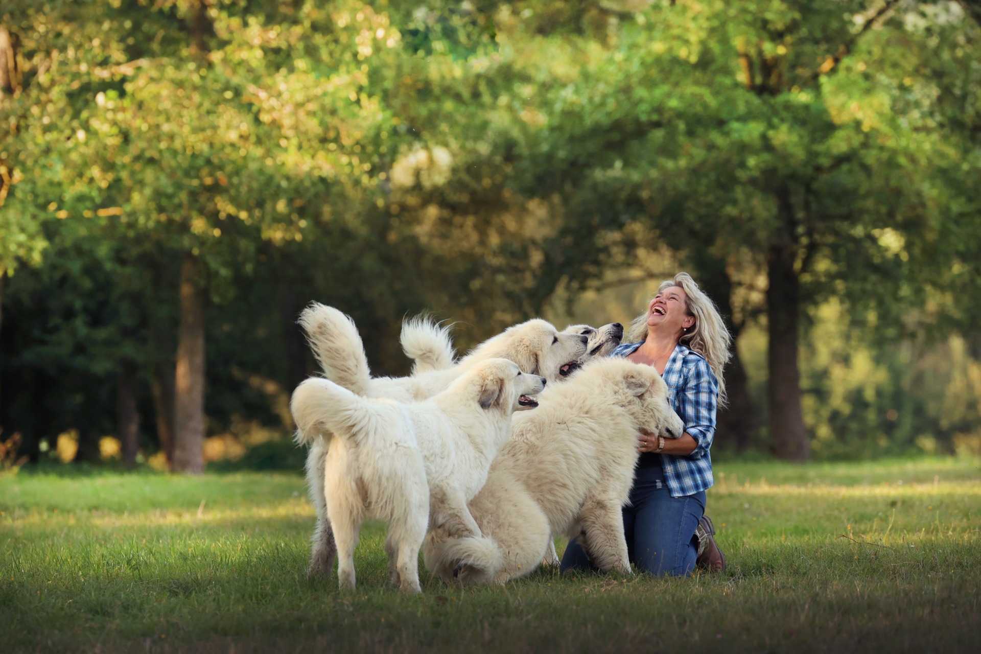 Dvě holky a tři psi Pyrenejského horského psa ,, bydlí" u ovcí a chrání je před nevítanou návštěvou- vlky.